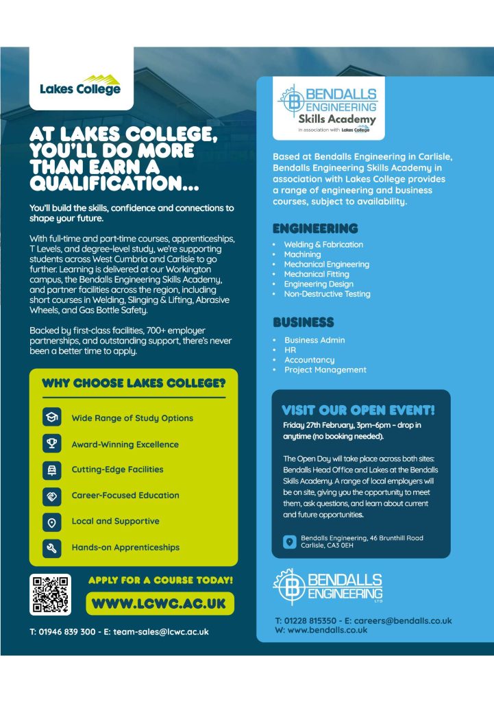 Our 2026 Open Day will take place across Bendalls and the Skills Academy on Friday 27th February. Visitors are welcome to drop in any time between 3pm and 6pm to find out more about our apprenticeships, training routes and career opportunities.